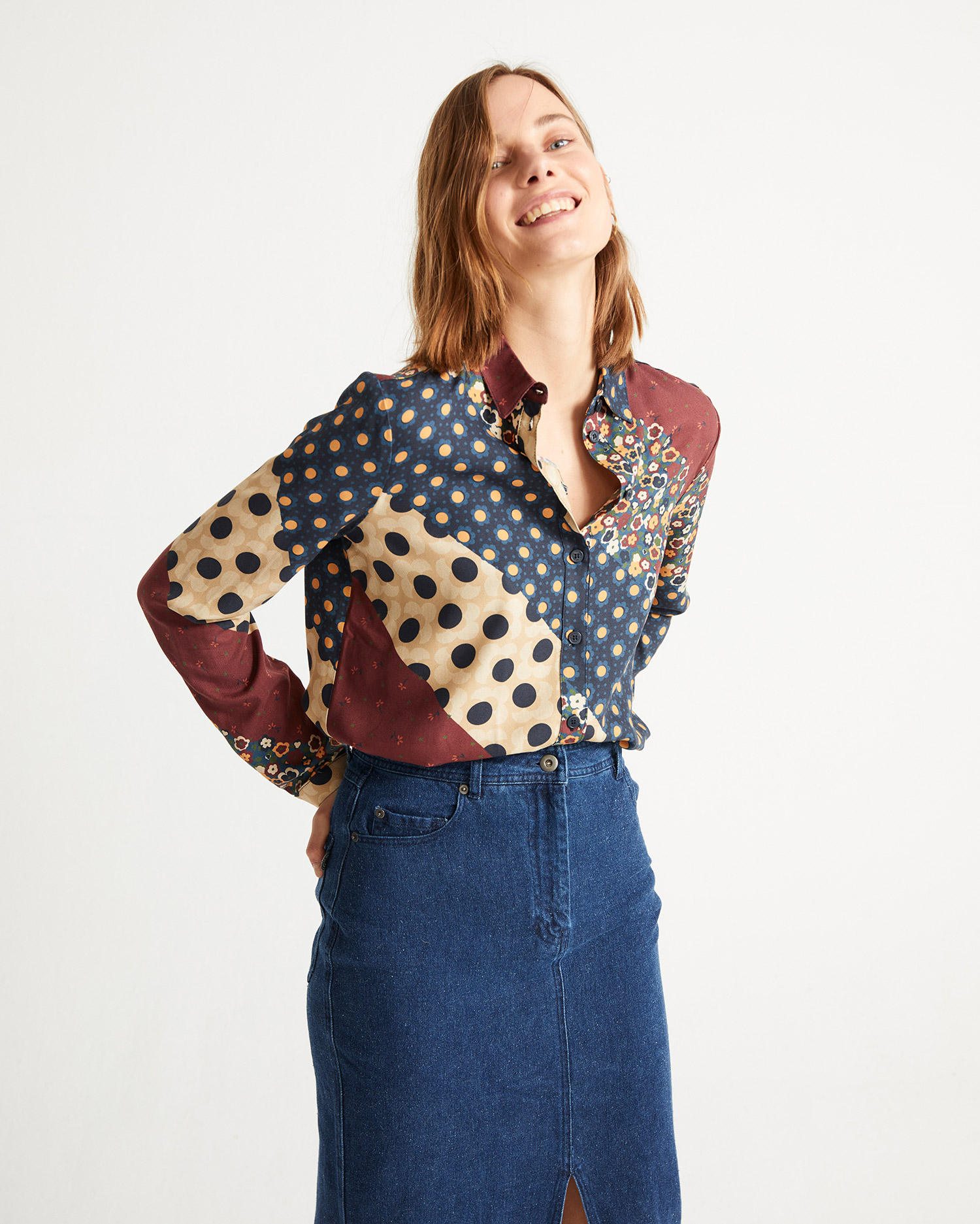 Chemise à coupe droite et manches longues avec manchettes. Les boutons sont doublés sur le devant.